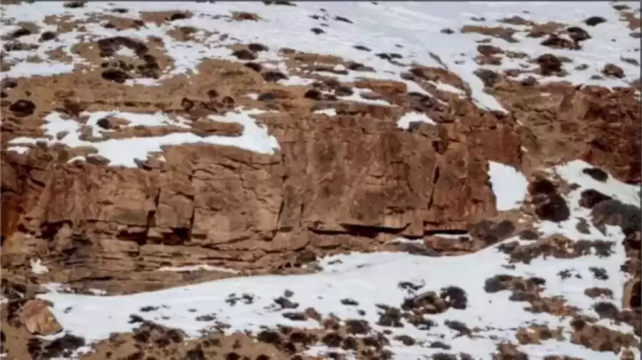 In questa immagine, vedrete una vasta distesa di terra completamente coperta di neve, creando una scena prevalentemente bianca. All’interno di questo paesaggio invernale, un leopardo delle nevi rimane nascosto, proponendoci la sfida di individuare l’elusiva creatura.