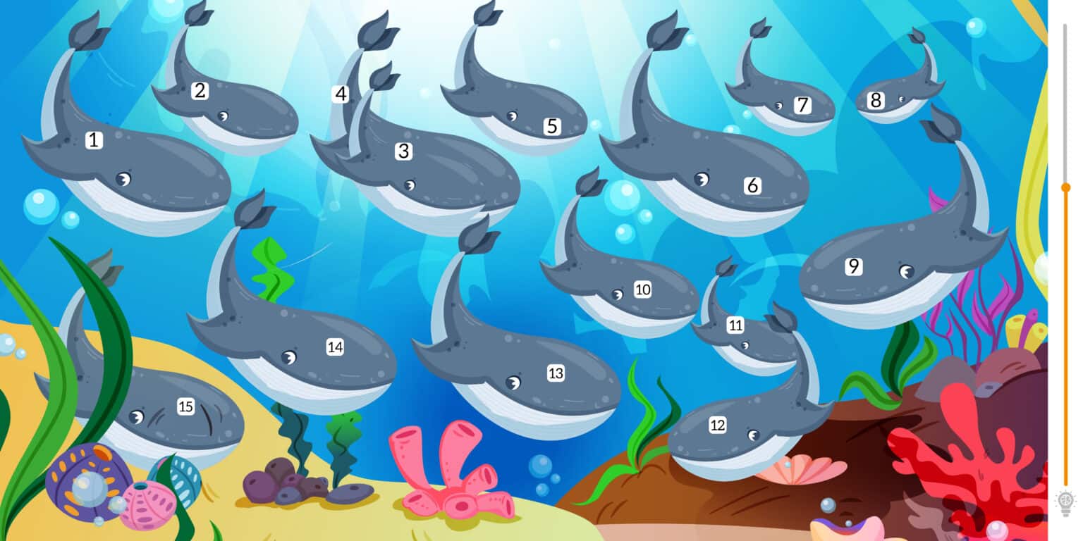 In questa immagine vedrai diverse balene. Lo scopo del gioco è trovare il numero totale. Per fare questo, devi contarli, ma non è tutto. Alcune balene si nascondono e sono piuttosto difficili da trovare. Se hai gli occhi da falco non avrai difficoltà a individuarli.